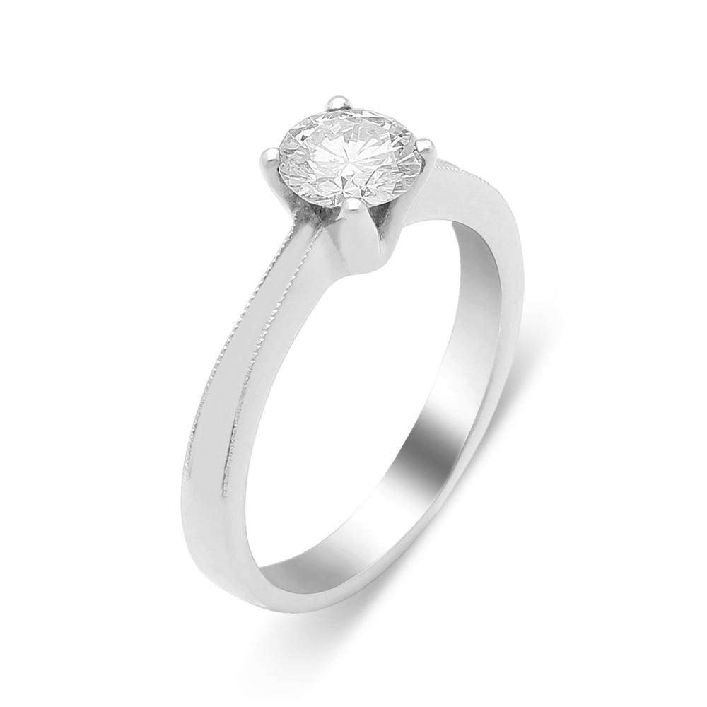 An 18ct white gold solitaire ring showcasing a round brilliant cut diamond secured in a classic four-claw peg setting offset with a fine tapered band with a milgrain finish on the edges.
