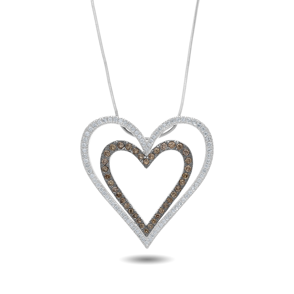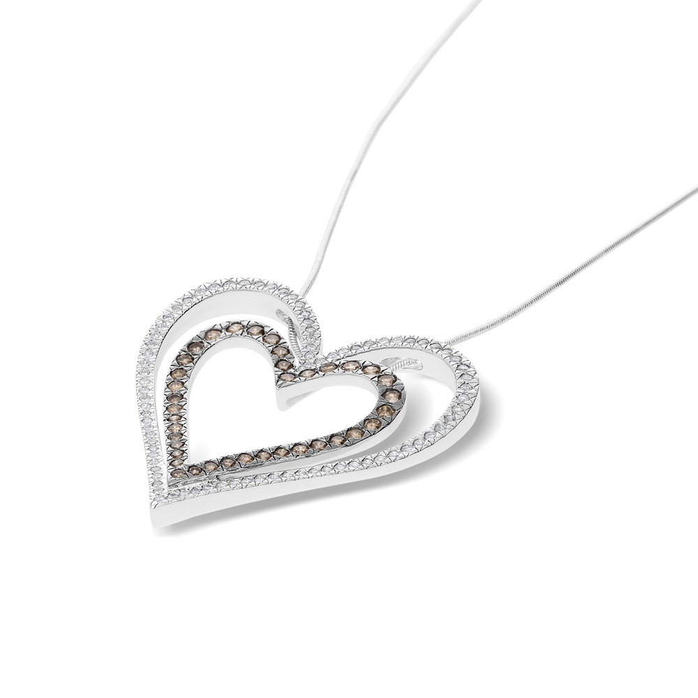 An 18ct white gold pendant formed with two heart motifs encrusted with white and champagne diamonds secured in pavé settings.