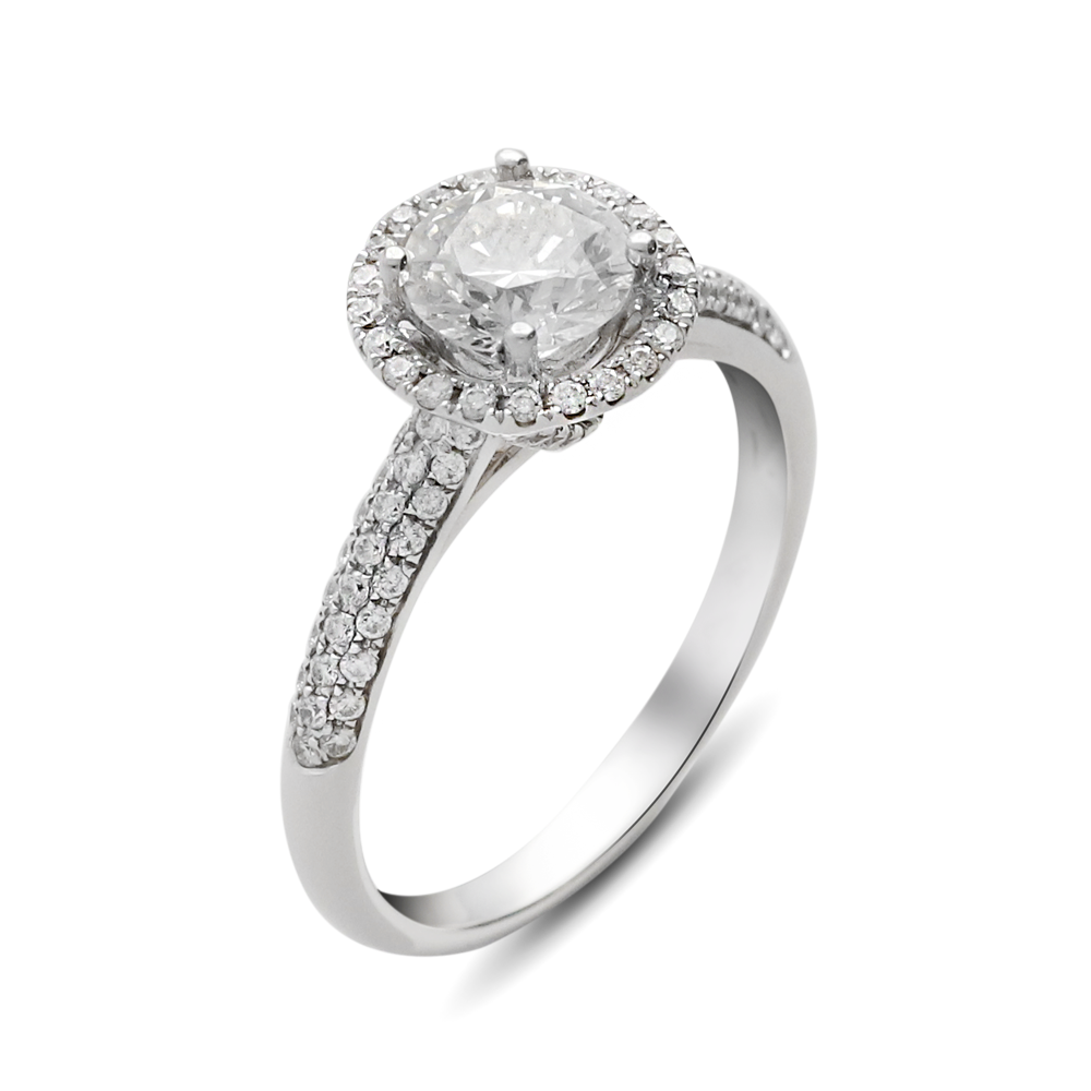 An 18ct white gold ring showcasing a round brilliant cut diamond secured in a 4-prong setting enhanced with a halo of diamonds offset with multiple rows of diamonds along the band on either side with a decorative gallery encrusted with diamonds.