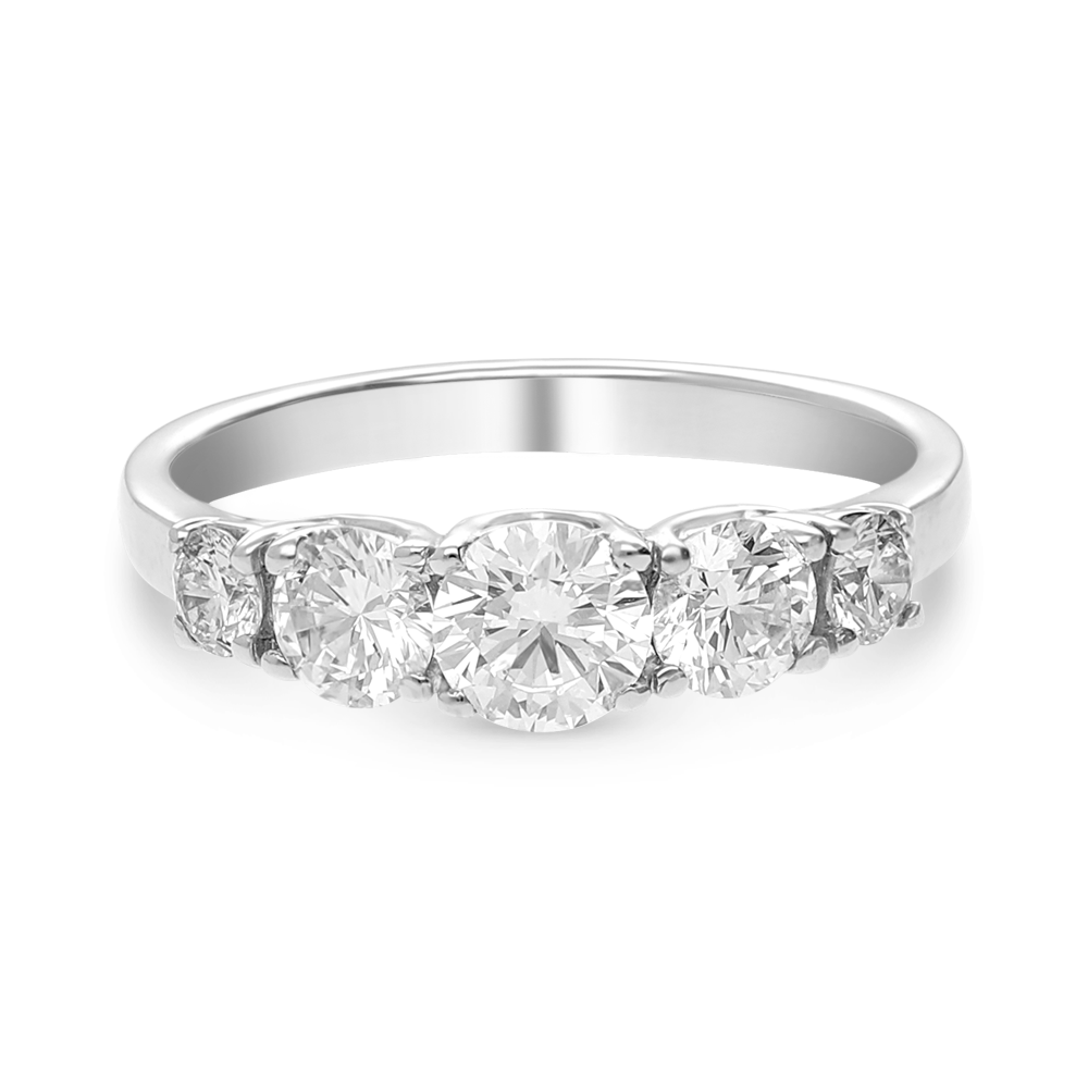 An 18ct white classic cross-over setting showcasing a round brilliant cut diamonds offset with two graduating diamonds on either side.