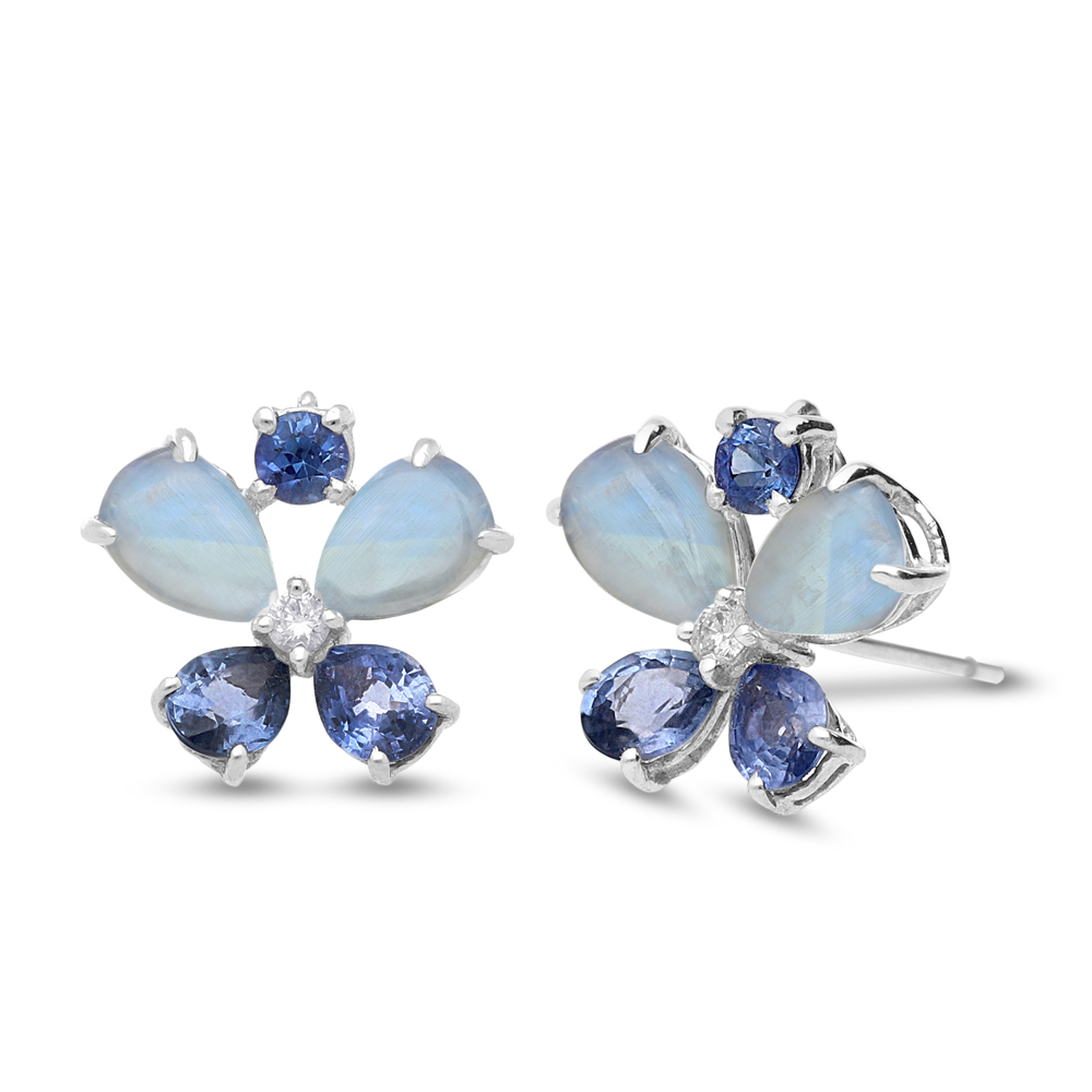 The earrings’ centrepiece is a cabochon moonstone, expertly crafted into a fancy shape that emphasizes its natural shine and iridescence. The moonstone’s ethereal quality is complemented by delicate blue zircon gemstones and diamonds adding a touch of classic sophistication. Each earring features a transformative design, allowing you to wear them as stud earrings or add the drop earring to make a more dramatic statement.