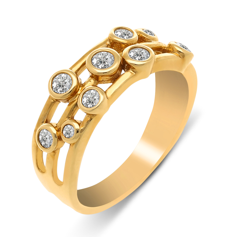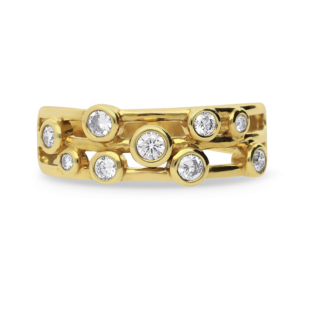 An 18ct yellow gold ring with scattered round brilliant cut diamonds secured in bezel settings.