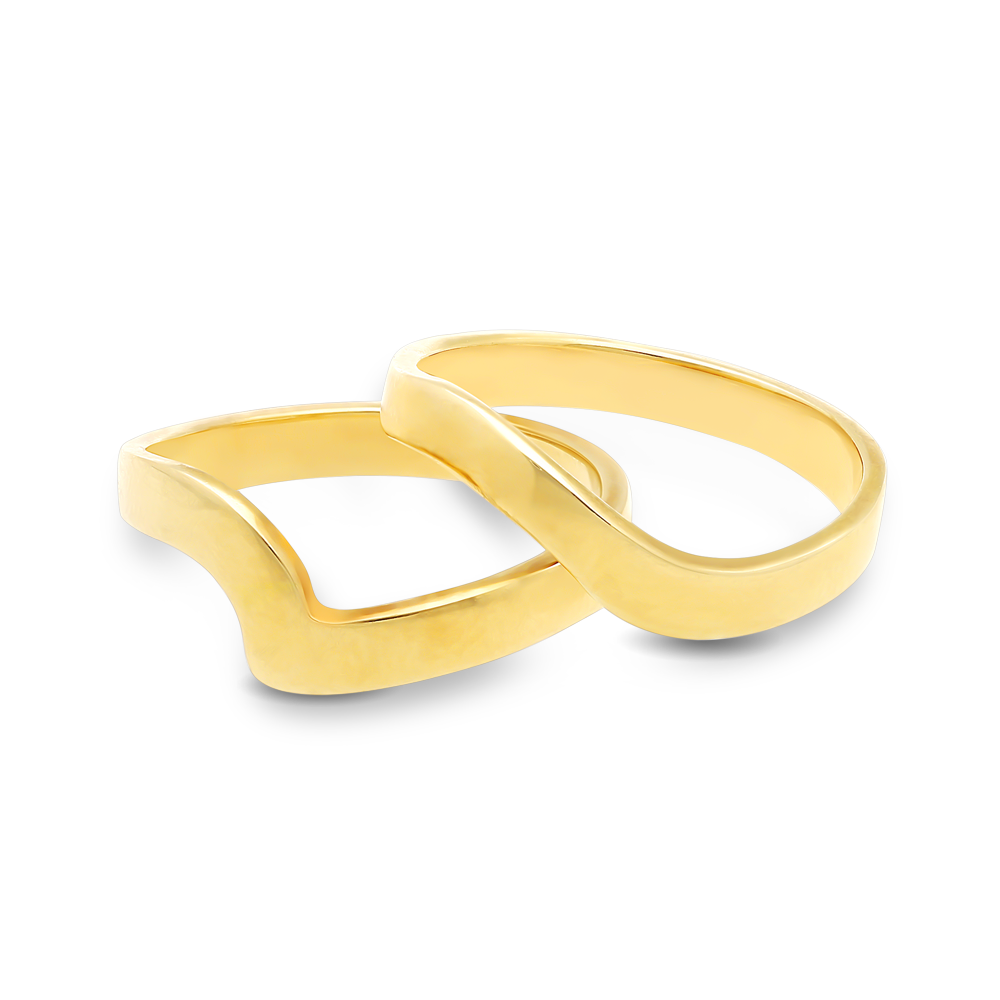 An 18ct yellow gold ring containing a round brilliant cut diamond secured in a bezel setting with an organic flowing band set with diamonds offset with a fitted band on either side.