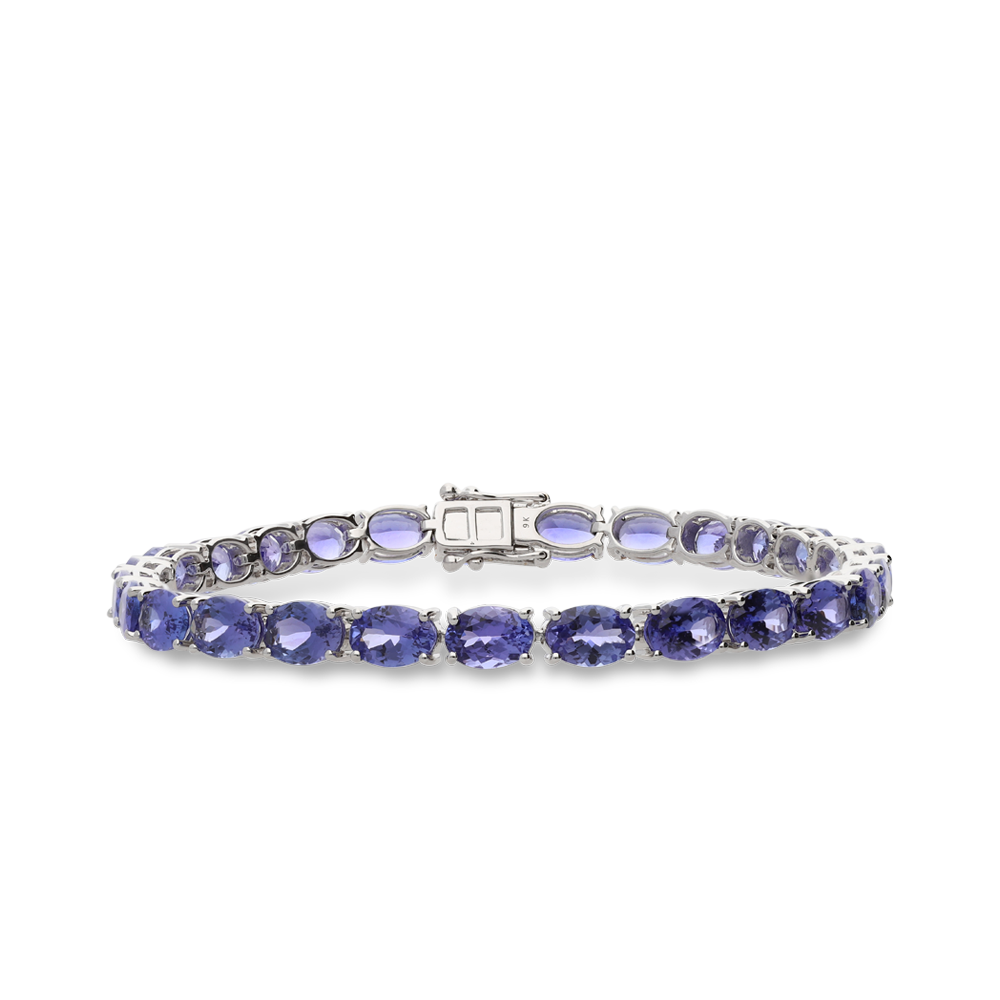 A 9ct white gold bracelet boasting oval cut shaped tanzanite gemstones secured in 4-claw settings completed with a box clasp.
