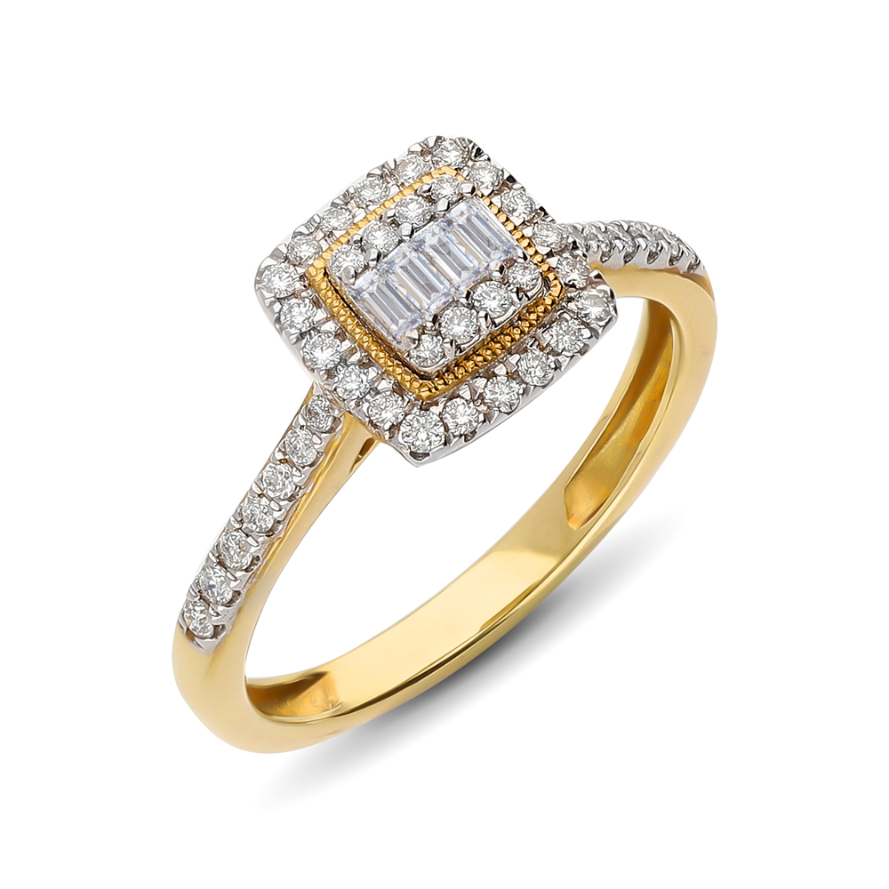 A 9ct yellow gold cushion shape halo illusion set ring with baguette and round brilliant cut diamonds.