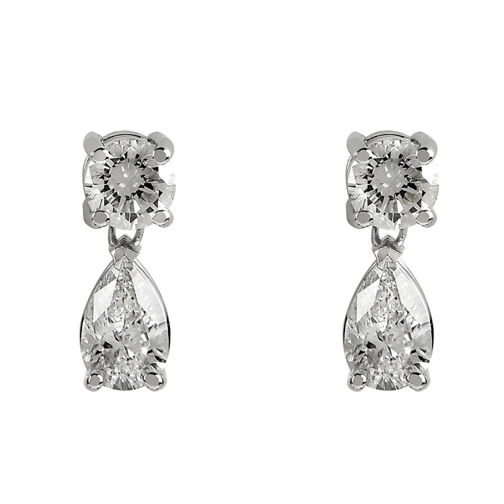 Pear shaped diamonds (1.46ct) set in 18kt White gold, hanging from round brilliant cut diamonds (0.36ct).
